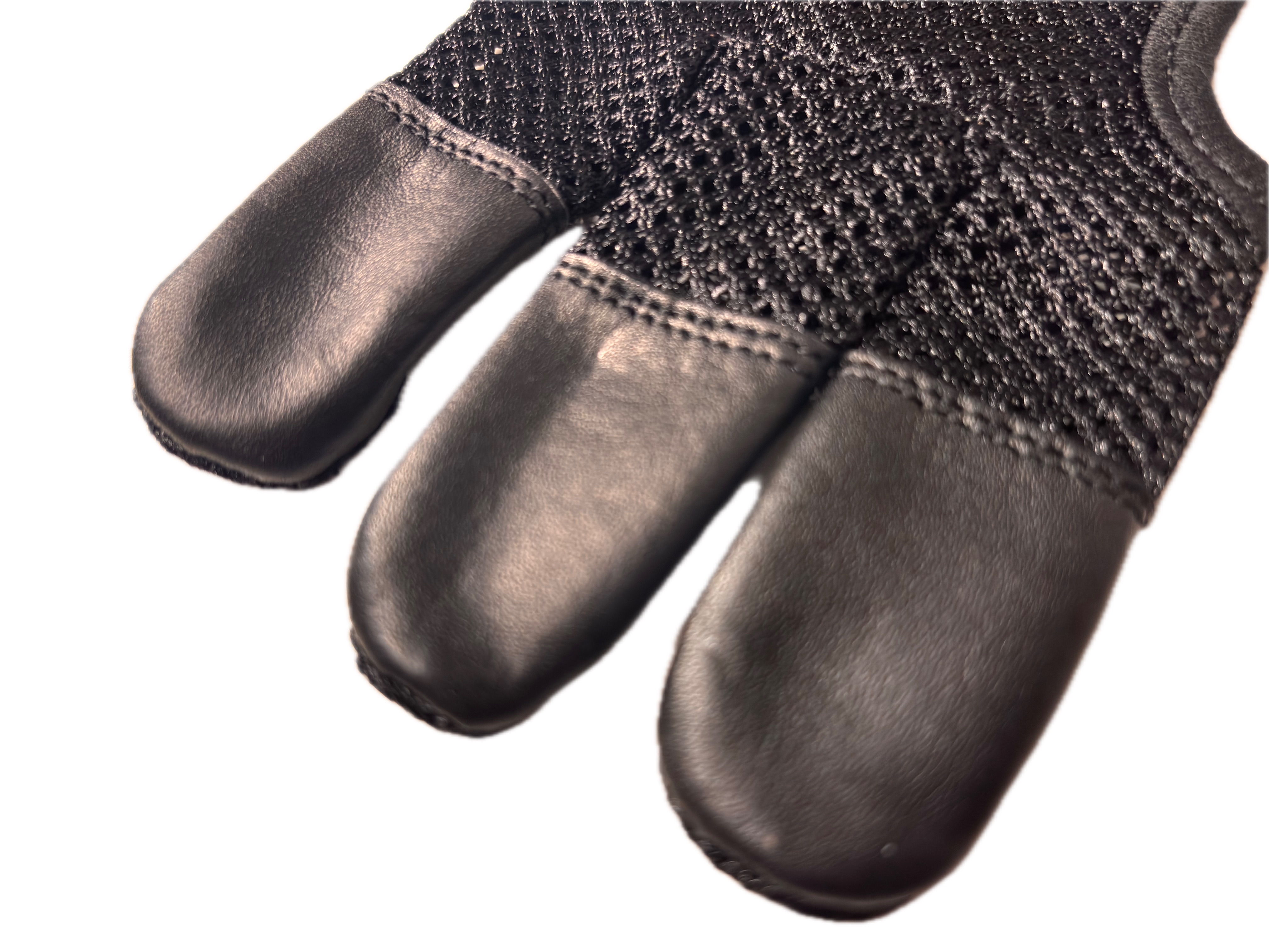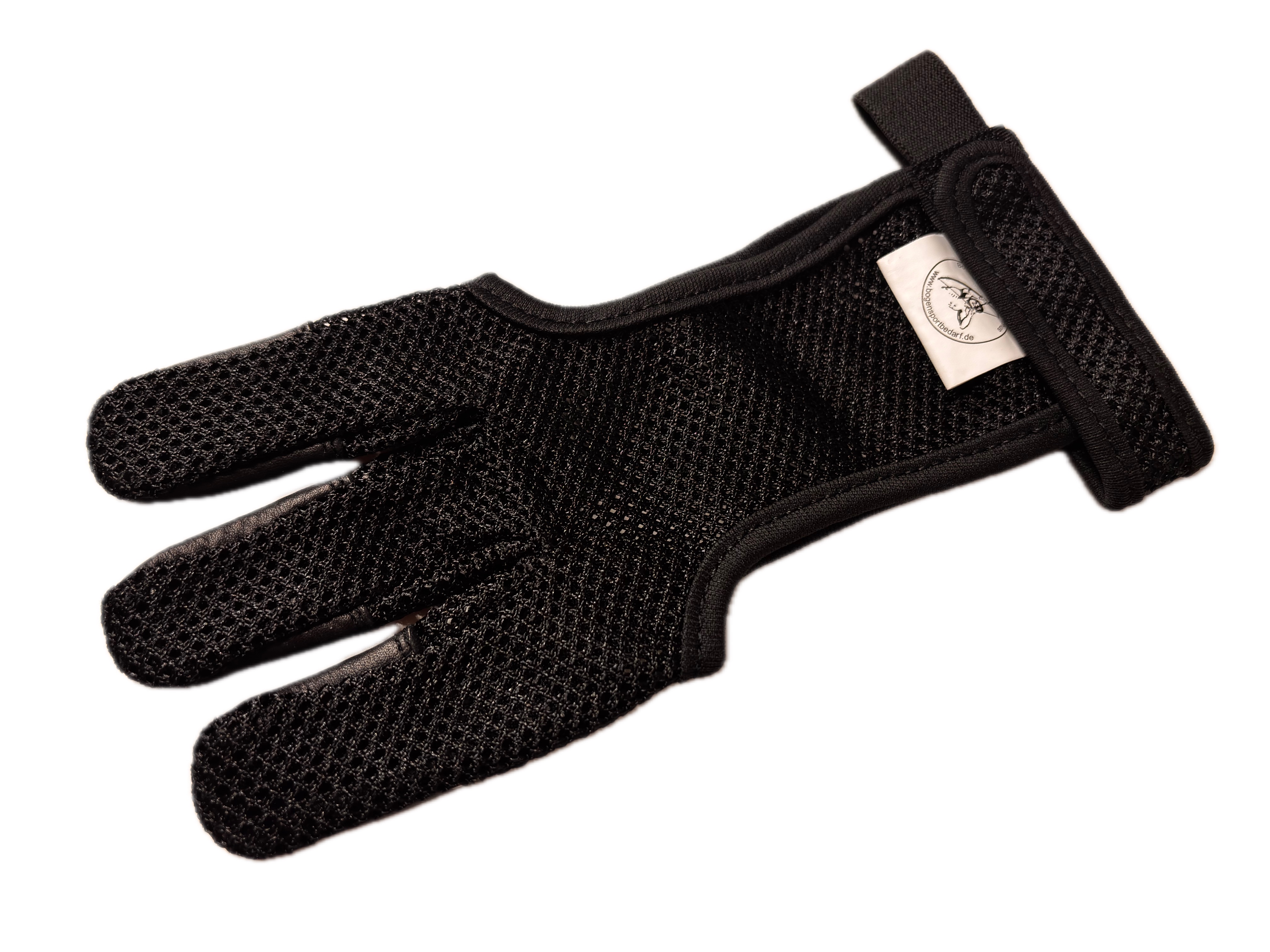 Dieser schwarze Schießhandschuh kombiniert ein luftdurchlässiges Netzmaterial mit strapazierfähigen Lederauflagen an den Fingerspitzen. Das Leder sorgt für ein sauberes Lösen und ein kontrolliertes Gefühl beim Schuss.